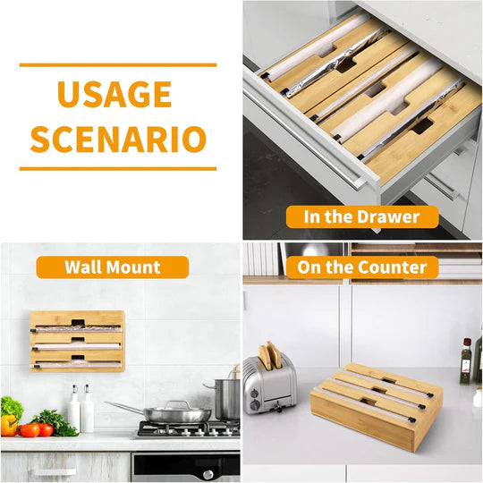 - Du désordre au rangement : le distributeur de papier plastique peut être fixé au mur sur le mur, à l'intérieur du tiroir de cuisine ou sur le comptoir. Plusieurs étiquettes autocollantes incluses peuvent aider à mieux organiser différents types de rouleaux d'emballage. Plus de boîtes en carton cassées.